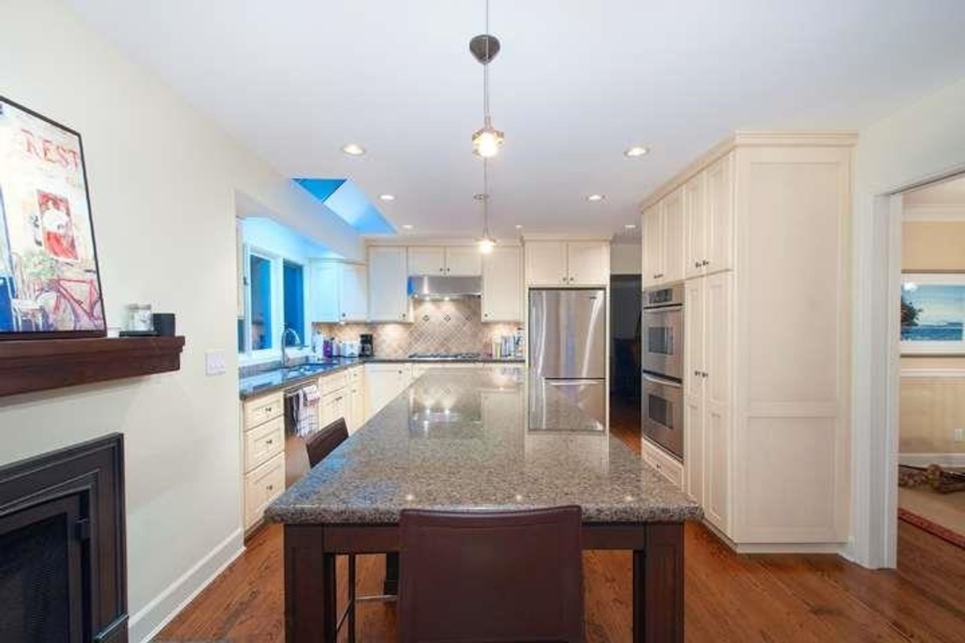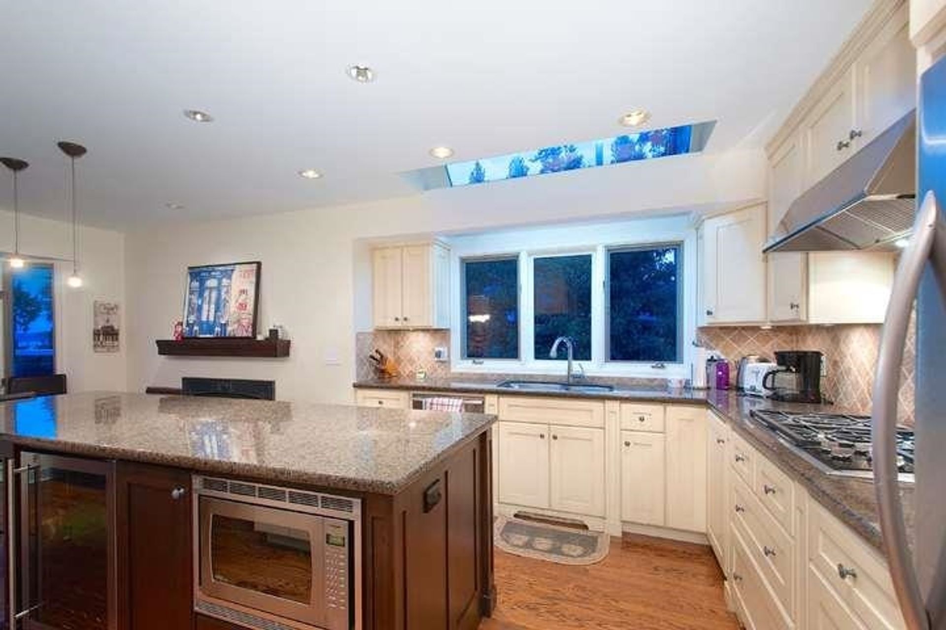 Exceptional family home, tastefully renovated in 2006, offering approx. 3,500 sqft across three levels. The traditional layout includes 4 well-appointed bedrooms upstairs, highlighted by a luxurious primary suite with a walk-in closet and elegant ensuite. Main level features a welcoming foyer, formal living and dining rooms with large windows, rich hardwood and slate flooring, a gourmet island kitchen with breakfast bar, adjoining eating area, family room with coffered ceilings, fireplace and media centre, plus a private office, rec room, and oversized double garage. French doors lead to a beautifully landscaped 1/3 acre with serene patios and lush gardens. Walk to West Bay School, McKechnie Park, and Dundarave.